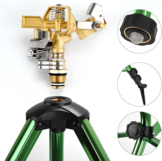 - 【Easy installation】First,install the base of the tripod sprinkler,then insert the three sharp corners into the soil,adjust the appropriate height and direction,and finally connect the hose and turn on the faucet.Installation is very simple,you can follow the instructions included to install