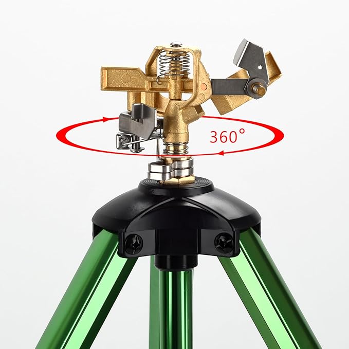 - 【Multi-functional design】The tripod sprinklers for yard is fully functional,and when the three corners are installed and inserted into the soil,it will be more stable,even the strongest water pressure will not sway.Sprinkler faucet can be rotated 360 degrees,can also be adjusted up and down height,wide coverage,you can reach the desired watering range at will.Free your hands and save water,time and money