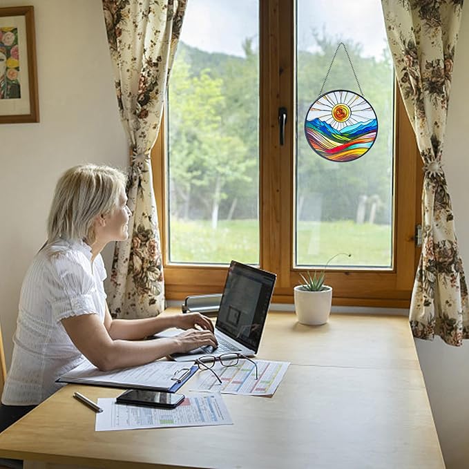 - 【stained Glass Window Hanging】This is a very beautiful artistic colorful sunrise suncatcher with a size of 6x6 inches which is perfect for windows, adding a touch of color without obstructing the view outside. This piece of glass was cut individually and painted by hand. It is skillfully handmade, and it is real glass, NOT plastic or acrylic.
