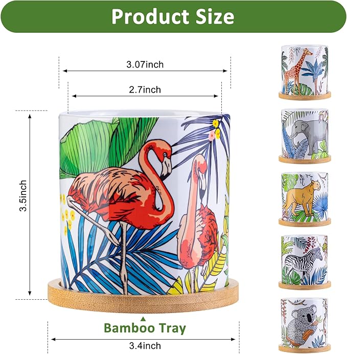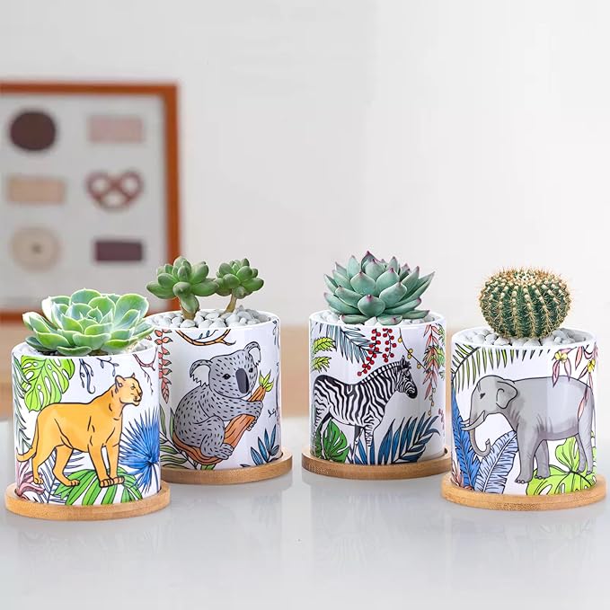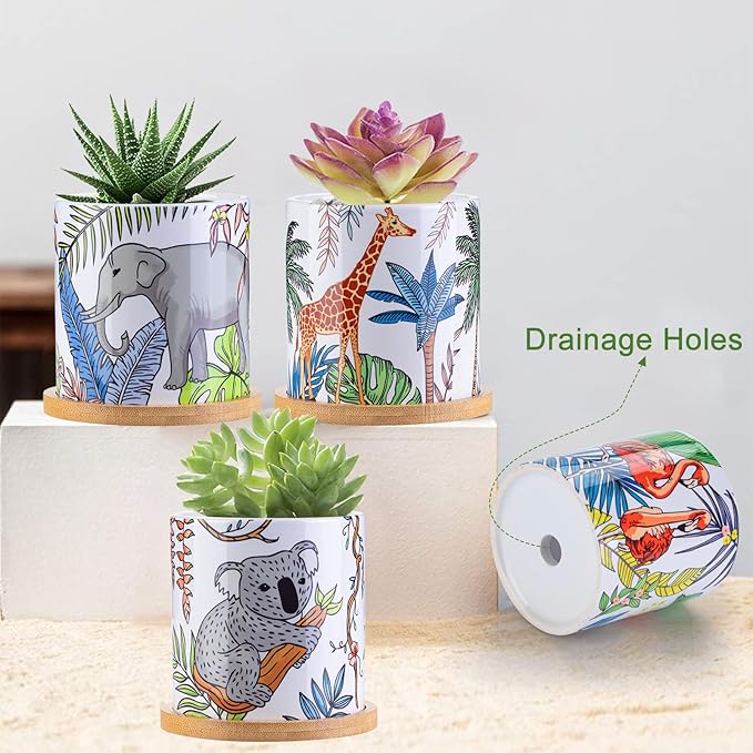 Succulent pots, 3.1Inch Ceramic Succulent Planter with Drainage Holes and Bamboo Tray, Animal Plant Pots Home Decor, Set of 6