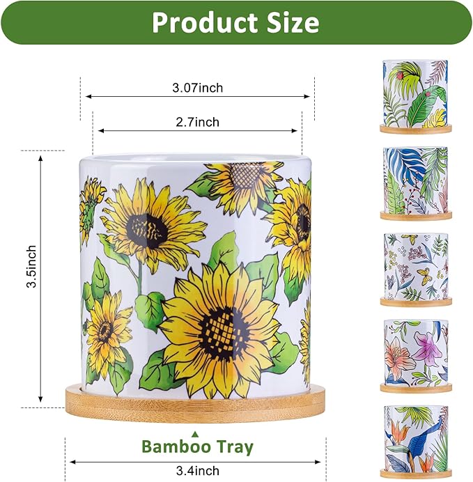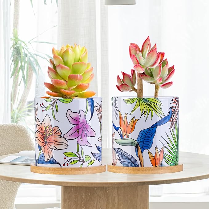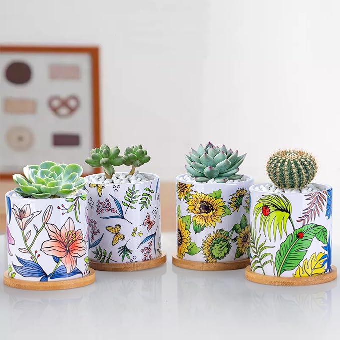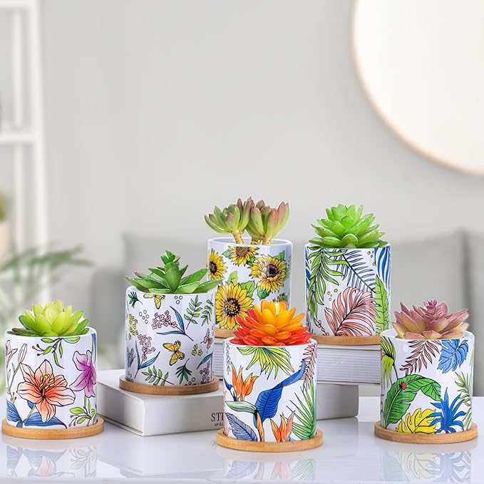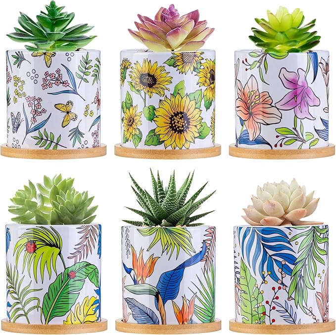 Succulent Pots for Plants, 3.1 Inch Ceramic Planter Pot with Drainage Holes and Bamboo Tray, Home Decor, Set of 6 - Plants Not Included