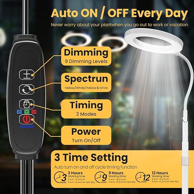- Three cycle timing settings, this plant light will automatically turn on/off according to your desired schedule every day: 3/9/12H.