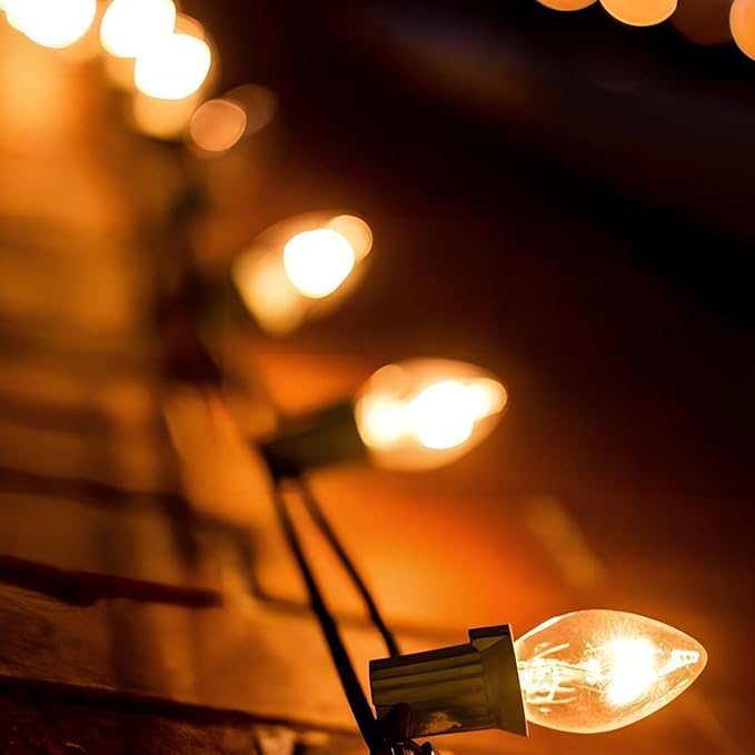 - Clear, Warm Glow:The clear C7 bulbs give off a soft, classic light that complements any holiday decor. Whether for Christmas or other special events, backyard lights bring warmth and elegance to any space. Each bulbs 5W, C7/E12 Candelabra Base,125W per string,120V Power, warm white Christmas lights are UL Listed for indoor and outdoor use