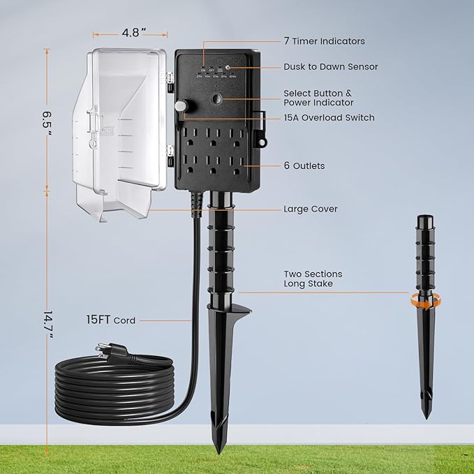 - Automatic Dusk to Dawn Stake Timer with 15FT Cord: Features a photocell light sensor with three modes and eight timer settings; Options include Dusk to Dawn, ON at Dusk with OFF after 2, 4, 6, 8, or 10 hours, and Power Always ON/OFF; One button easily selects your preferred setting
