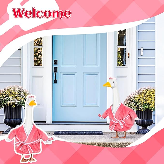 - Lady Goose Design: goose clothes for cement goose come in a vibrant pink color coupled with an endearing lady design; The pink and white colors add a different appeal to your lawn, ensuring it stands out