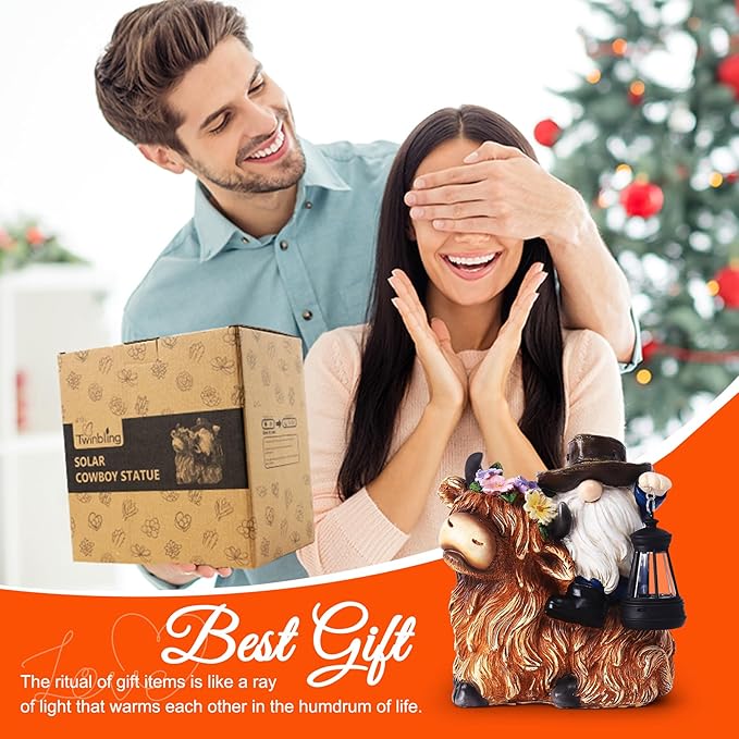 - 【Highland Cow Gnome】This adorable gnome, with a classic beard and hat, perches on the back of a friendly Highland cow adorned with a flower crown. The gnome holds a lantern and lights it up at night to add a magical glow to your garden, patio, lawn or porch.The gnomes figurine measures 5"D x 5"W x 5"H, about 1.1 lbs.