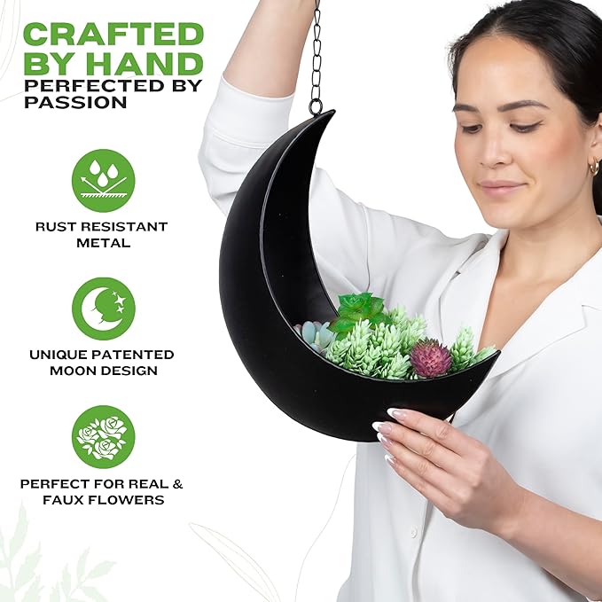 Black Hanging Moon Planter with Drain Holes - Moon Room Decor - Unique Planters for Succulents,Air Plant, Cactus, Artificial Plants- Plant Lover Gifts - Boho,Hippie, Birthdays,Witchy Gifts for Women