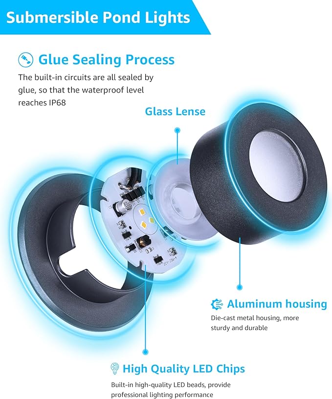 - GLUE SEALING PROCESS - The fountain lights adopts the glue sealing process. The built-in circuits are all sealed by glue, so that the waterproof level reaches IP68, and the maximum diving depth can reach 16.4ft. The adhesive layer also has good heat dissipation performance, ensuring that the fountain lights led underwater can be used underwater for a long time.