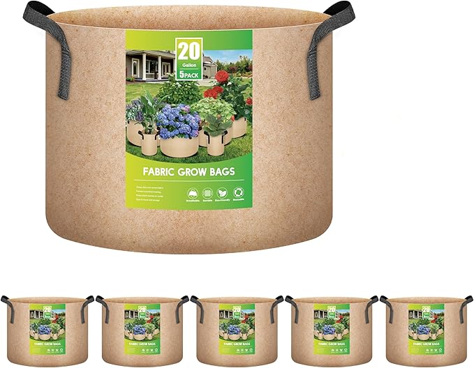 iPower 5-Pack 20 Gallon Plant Grow Bags Thickened Nonwoven Aeration Fabric Pots Heavy Duty Durable Container, Strap Handles for Garden, Tan New