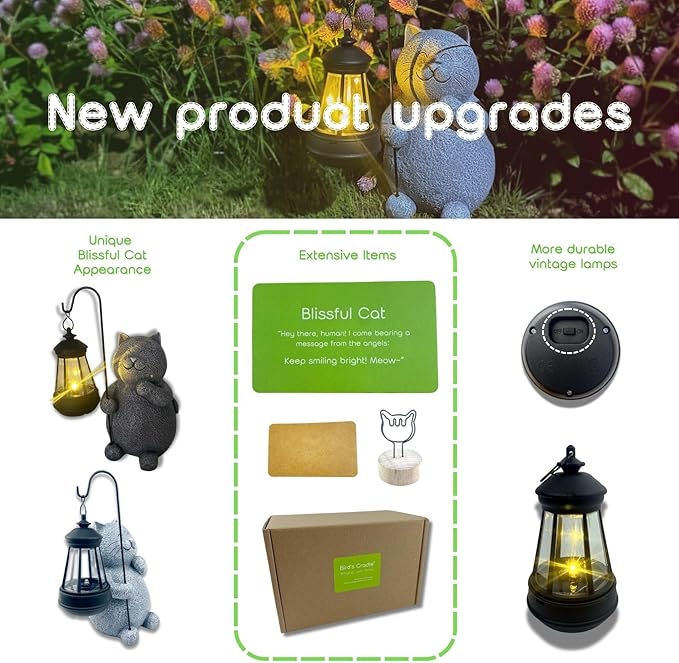 - 【Product Upgrades】The Blissful Cat sculpture, now pending a design patent, includes a unique cat cardholder, greeting card, and a blank card for your own messages. Upgrade the product packaging by using Tuck Top Gift Boxes, and include raffia grass for decor. Upgraded the cat solar lights durability with more efficient solar panels and moved the switch to the bottom to improve outdoor garden sculpture waterproof performance
