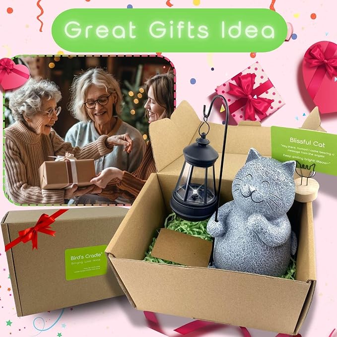 - 【Blissful Cat - The Great Gifts】Blissful Cat figurines decoration, packaged in a gift box. We've given this cute cat more meaning by upgrading cat shape and packaging. The Solar Cat Statues light decor is the best gifts for birthday, Mother's Father's Day, Christmas, Easter, Thanksgiving, Valentine's St. Patrick's Day, New Year's, graduation, weddings, anniversary. It can be given to cat animal lover, grandma, sister, aunt, wife, mothers, daughters, friends, girlfriends, gardener, lady, women