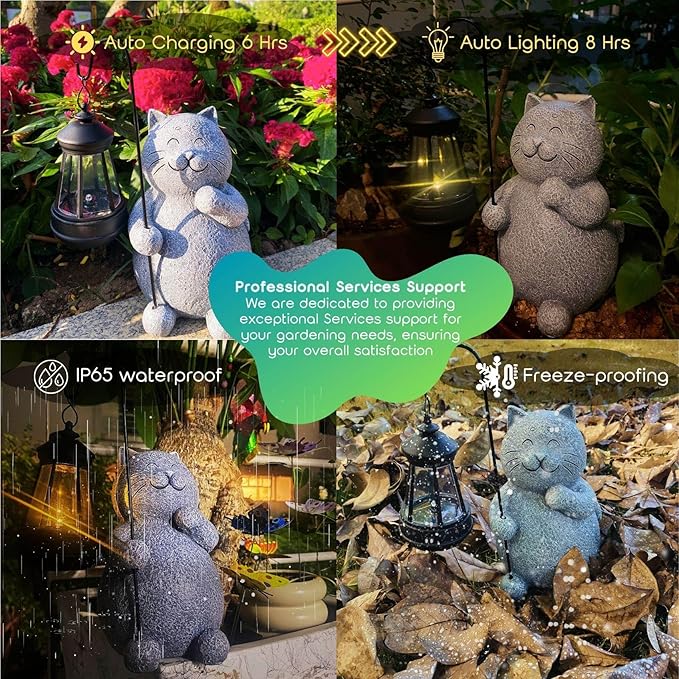 - 【Easy to Use and Weather-Resistant】To use the lantern for the first time, set the bottom switch to the 'on' position. The solar-powered panel will fully charge in 6-8 hours of daylight and provide automatic illumination for 8-10 hours at night. The cat figure is made of resin with a hand-painted faux stone finish and coated with UV protection for outdoor use. It has an IP65 waterproof rating, ensuring it is protected from rain and snow