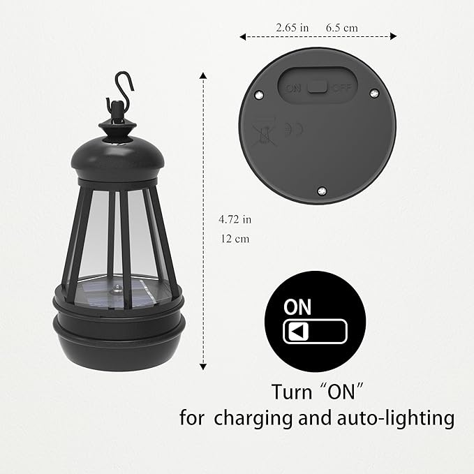 - Portable Size & Easy Operation: 8.1"×3.5"×9.8". For the first use, turn the switch to “ON”, simply leave it charging in the sun (in case the energy runs out after a long period of time out of the sun during transportation), and it will automatically light up at dusk