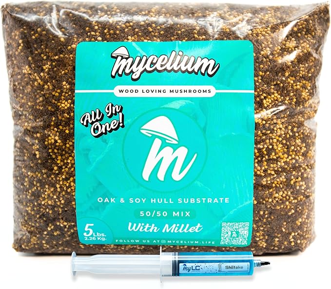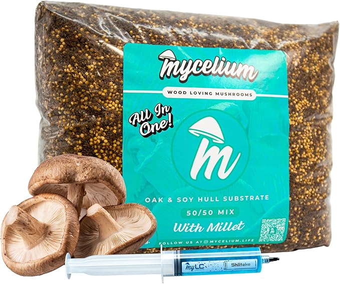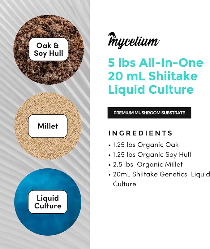 Mycelium’s Shiitake Gourmet Mushroom Kit | 5LBS Oak & Soy Hull with Millet Blend | 20ML Liquid Culture Syringe | All-in-One Complete Cultivation Kit | Pre-Sterilized - Home Growing Made Easy