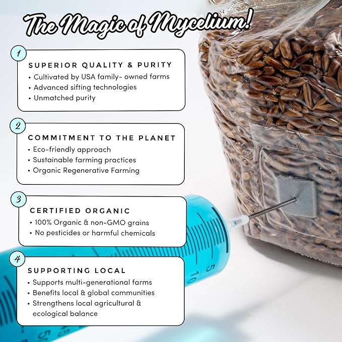 - Pre-Sterilized for Your Convenience: Enjoy a hassle-free cultivation experience with our pre-sterilized substrate and liquid culture syringe, eliminating contamination risks and allowing you to focus on the growth and health of your mushrooms.