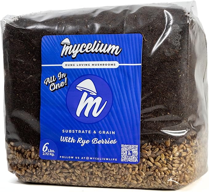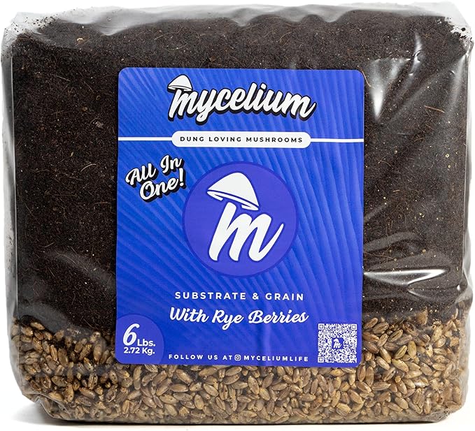 Mycelium's Superior Dung-Loving Mushroom Substrate & Rye Berries Grain 6 LB All-in-One Bag – Organic Coco Coir, Vermiculite & Gypsum Formula, Pre-Sterilized & Ready for Easy Home Cultivation