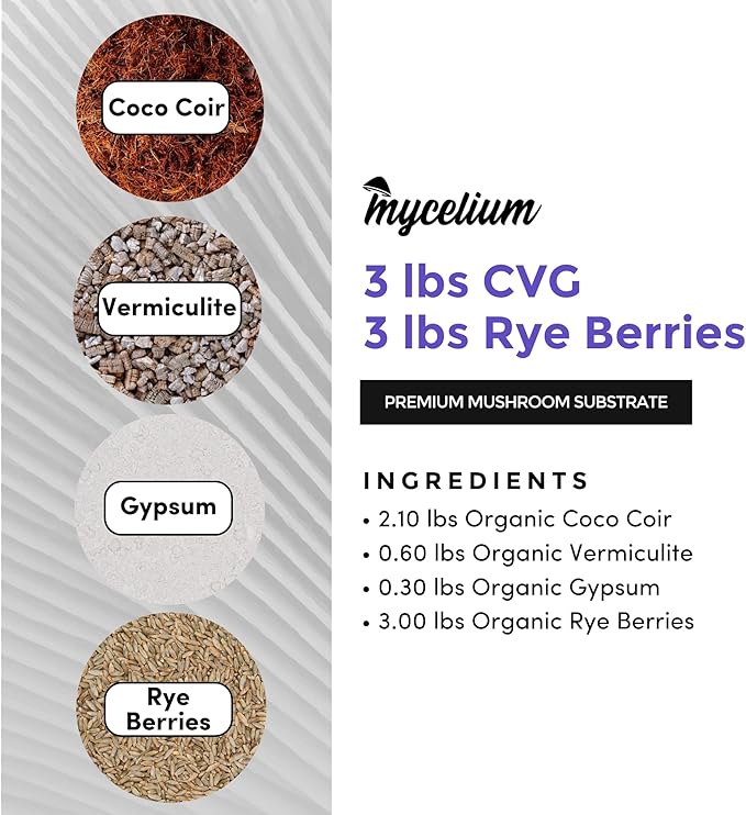 - Expertly Formulated - Our 6 lb GMO-free substrate combines 3 lbs of premium rye berries grain with 2.1 lbs of hydrating coco coir, 0.6 lbs of aerating vermiculite, and 0.3 lbs of nutrient-rich gypsum. This mix is the perfect foundation for growing dung-loving mushrooms.