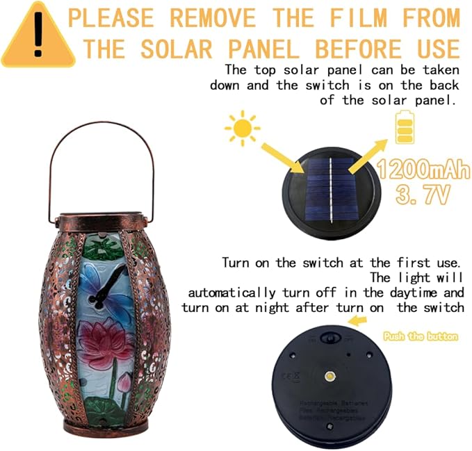 - Easy to Use: The film on the solar panel can be torn off; Before using for the first time, please remove the solar panel and press the switch behind the solar panel to turn it on; Solar table lantern automatically charges during the day and lights up at night