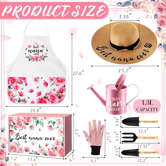 - Gardening gift set for Nana: This gardening gift set includes a pink metal watering can, a straw hat, a soil shovel, a transplanting shovel, a cultivator, a pair of gardening gloves and a rose pattern apron. Packaged in a rose-patterned gift box, it's the ideal gift for any grandma who loves spending time in the garden