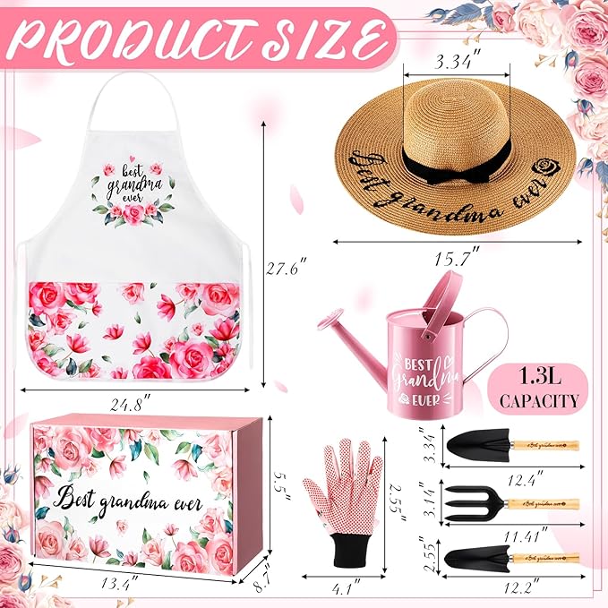 - Gardening gift set for Grandma: This gardening gift set includes a pink metal watering can, a straw hat, a soil shovel, a transplanting shovel, a cultivator, a pair of gardening gloves and a rose pattern apron. Packaged in a rose-patterned gift box, it's the ideal gift for any mum who loves spending time in the garden