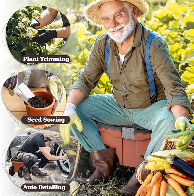 - ROLLING GARDEN CART WITH SEAT - This garden stool is ideal for anyone eager to ease back and knee pain when planting and weeding, as its lid offers a sturdy seat that makes low-to-the-ground tasks much easier, with less need for crouching and stooping.