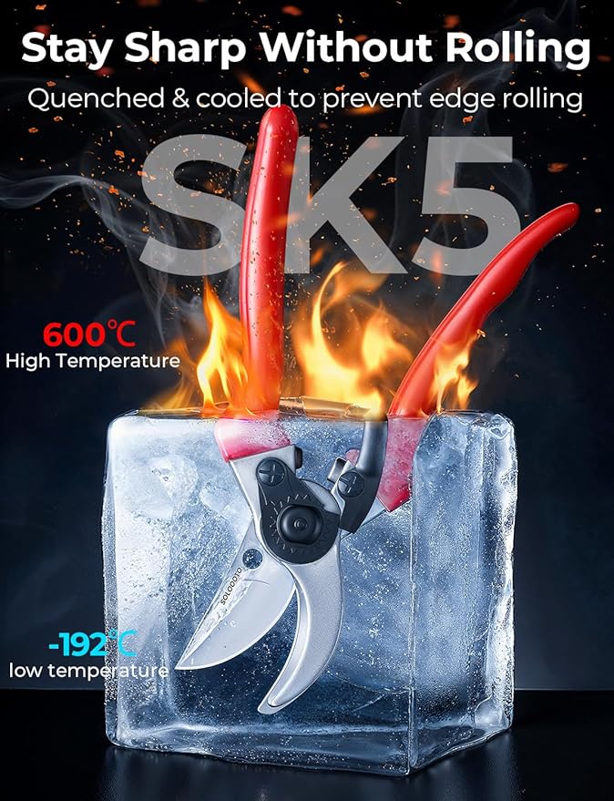 - [Sharp, Clean Cuts Every Time] Crafted from Japanese SK-5 high carbon steel, the bypass pruning shears for gardening feature ultra-fine polished curved blades, ensuring precise and clean cuts without causing extra damage to plants. The heat-treated, hardened SK-5 high carbon steel maintains sharpness even with frequent use, preventing the garden pruning shears dulling and chipping.