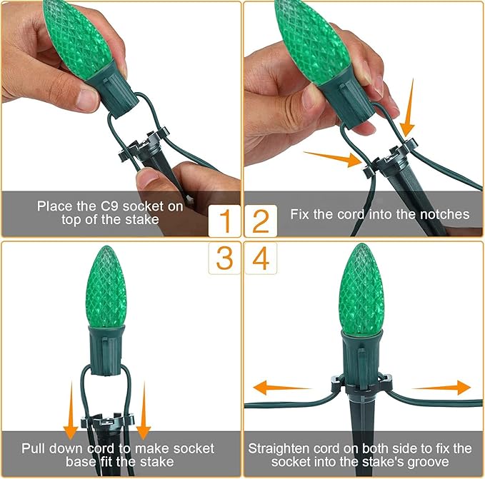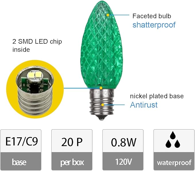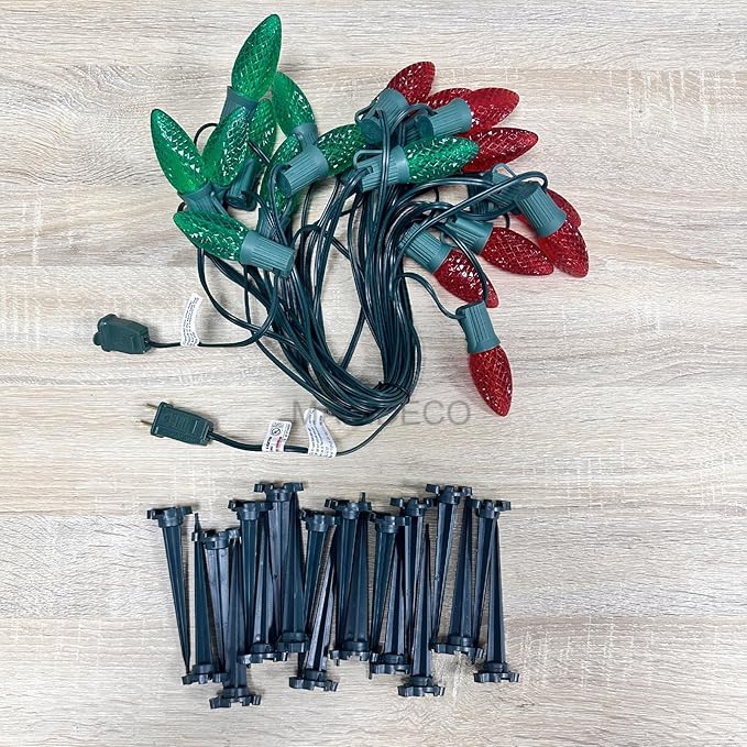 - 2 Pack C9 White LED Pathway Lights - MAINDECO C9 Christmas walkway lights are 30 feet long in total which contain 20 red and green C9 LED SMD strawberry faceted bulbs with 18 inches spacing, 20 Stakes, E17 base sockets. After installing the ground stakes, it can be fixed in the ground to add Christmas holiday lights to your yard, garden and pathway, etc.