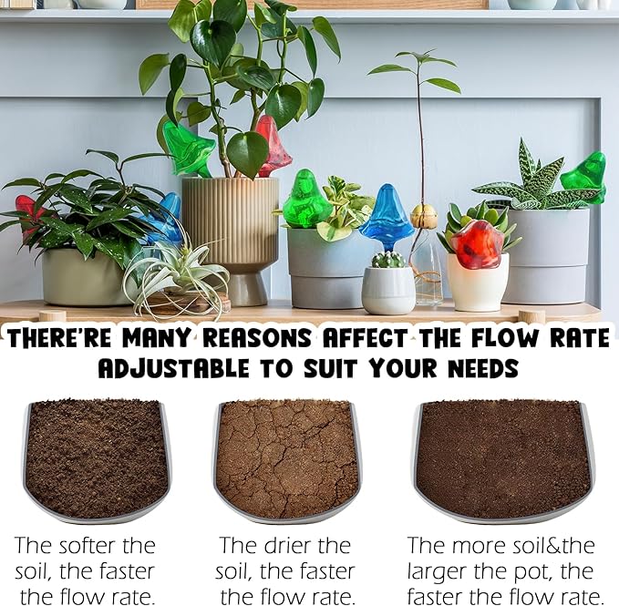 - 🌻PLANT WATERING SPIKES WHILE AWAY:No more worries about your plants when you're on vacation,traveling,business trip,any scenario where you need to leave the house. You can adjust the number of mushrooms placed,the angle of tilt,etc depending on how long you are away from home. Suitable for different plants. Like bonsa,pot plants,hanging plant,any outdoor&indoor plants.