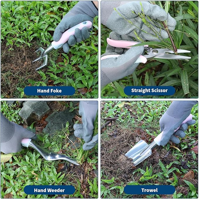 - 12-Piece Pink Garden Tool Set: Includes 8 gardening hand tools (scissor, pruner, crack weeder, trowel, hand fork, hand rake, trans planter, hand weeder , along with gloves, a kneeling pad, apron, and a multi-pocket storage bag to keep everything organized.