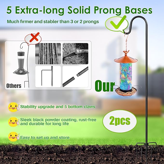 XDW-GIFTS Bird Feeder Pole for Outdoor, 60 Inch Shepherds Hooks Heavy Duty Garden Pole for Hanging Plant Basket, Solar Light Lanterns, Garden Plant Hanger Stands with 5 Base Prongs