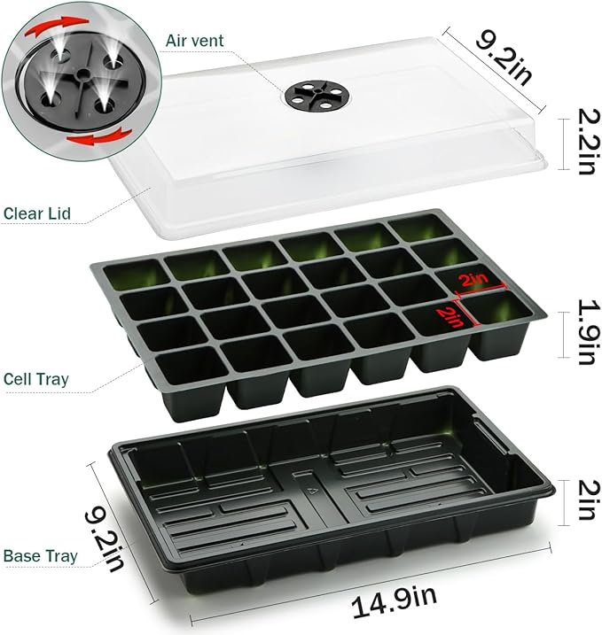 - 【Wider 24 Cells Seed Starting Trays】Rootrimmer's 24 cells seed starting trays with dome has a wider cells-2 inch wide. It is more convenient to plant in the upcoming spring. With 24 cells, you can start a variety of seeds all at once, such as herbs, flowers, and vegetables. 24 cells, that's like having 24 little greenhouses, each with the potential to grow your very own miniature forest.