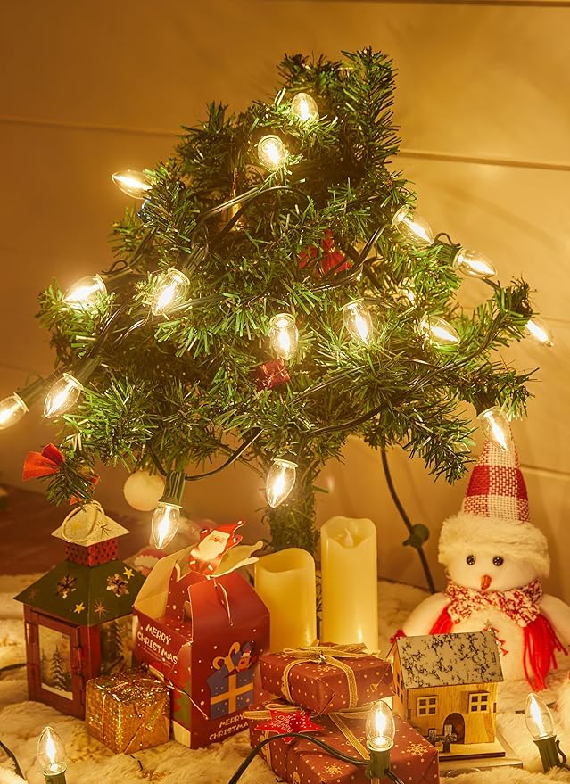 - C7 Clear LED Christmas String Lights Outdoor, 100FT Connectable Christmas Lights with 104 0.6W Bulbs(4 Spare), Vintage Hanging Lights for Xmas Holiday Party Patio Roofline House Decor, warm white light emanates from the bulbs to create a retro and cheerful atmosphere, and it doesn't affect the other bulbs to light up if one bulb doesn't light up