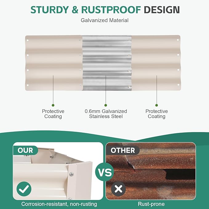 - 【 Upgrade Quality & Structure 】These raised garden beds are crafted from 0.7mm thick galvanized steel, featuring a rust-resistant coating that effectively withstands wet weather and sunlight. This durable design ensures that these raised beds for gardening will not easily deform or rust, making them an excellent choice for your outdoor gardening needs over the long term.