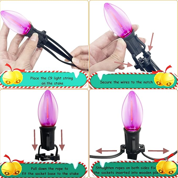 - Hanging or Staking: Create an impressive house outline by hanging our c9 led multicolor christmas string lights outdoor along your roofline, Christmas trees or stake them into the ground to illuminate paths in your lawn courtyard path, or garden. C9 led christmas lights offer flexible decorating options for a captivating display.