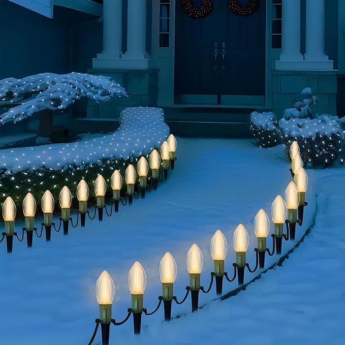 - 25FT Length outdoor christmas string lights with 26 warm white C9 LED Bulbs(1 Spare bulb), Illuminate your space with soft, warm white lights, ideal for creating a cozy holiday ambiance indoors and outdoors.
