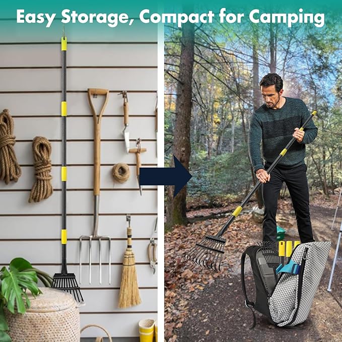 - Portable and Versatile: Its compact size makes this rake easy to transport and store, taking up minimal space in your shed or garage while still being accessible when you need it. Perfect for taking out while camping or spreading mulch, clearing small debris, or leveling soil in flower beds and vegetable gardens
