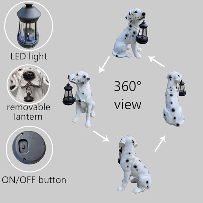 - 🐕Solar-Powered Illumination: Our Solar Dog Figurine for Garden features built-in solar lights that charge during the day and automatically light up at night. Enjoy a warm glow from the solar light for garden that illuminates your outdoor area for 8-10 hours, creating a magical ambiance as dusk falls.