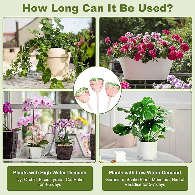 - 【Large Capacity, More Durable】Each set has 3 glass strawberry plant self watering devices, each with a capacity of 180ML. The water flow rate of the water bulb varies depending on the state of the soil and the water requirement of the plant, and the typical usage duration is 3-7 days.Tips: Please water the plants before and after using the watering ball. If your pot is larger, we recommend using 2 or 3 plant globes at the same time.