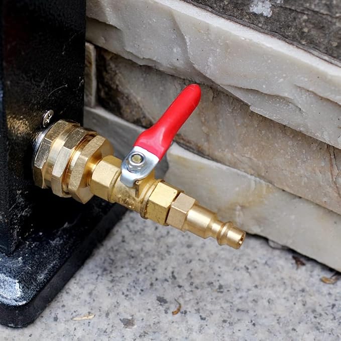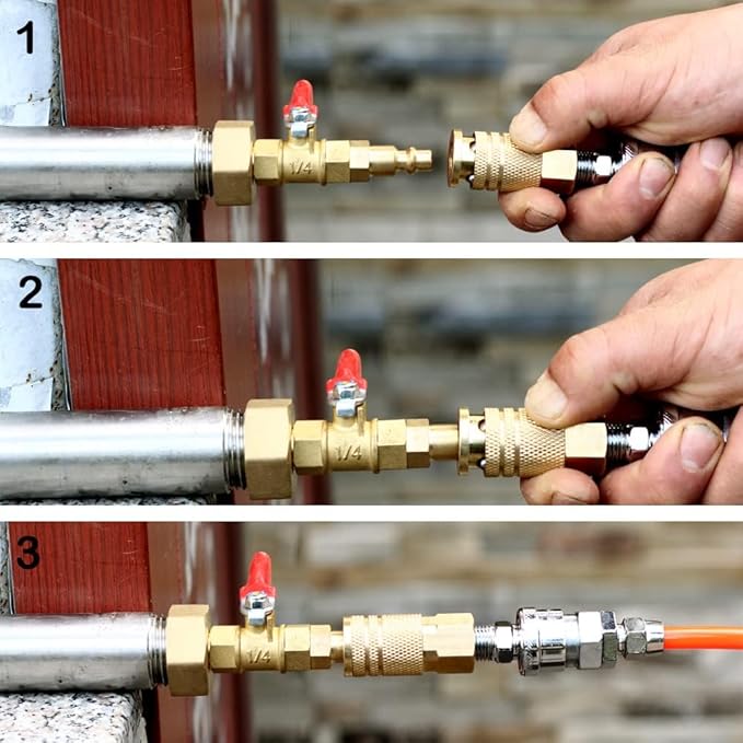 - EASY TO USE: Step one: screw the water pipe to the female thread side,connect the quick plug to the quick coupling inside the air compressor line, step 2: turn on the air compressor and rotate around the ball stem to open or close, step 2 adjust the air flow rate to blow dry water from the water pipe.