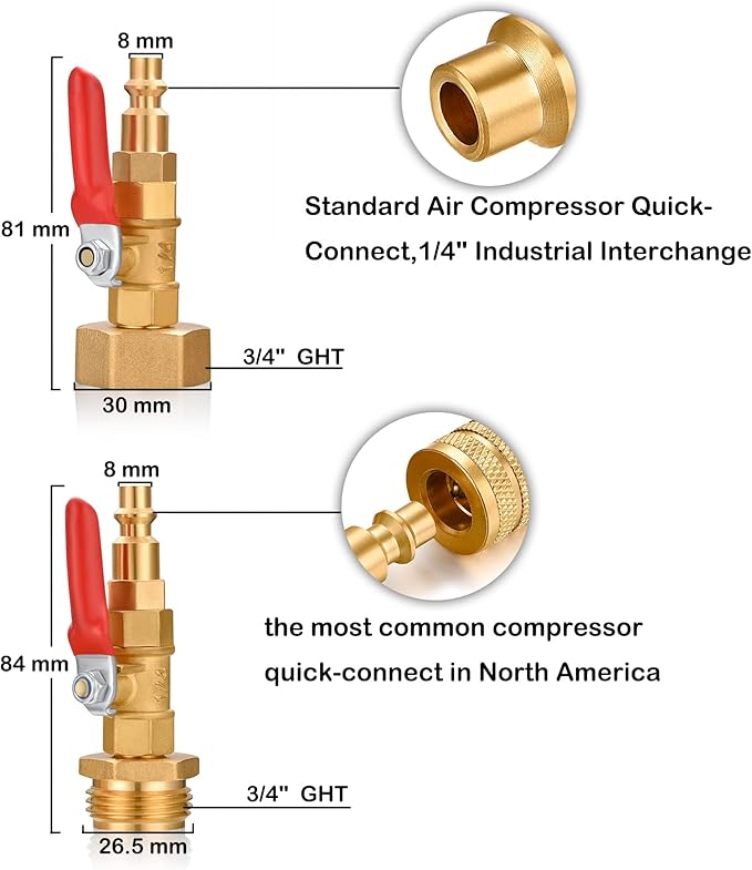 - STANDARD SIZE: 1/4 inch male air compressor quick plug to a Female 3/4 inch garden hose inner thread and 1/4 Inch Male Quick Connecting Plug and 3/4 inch Male GHT Thread, this is standard size and can be applied in most cases.