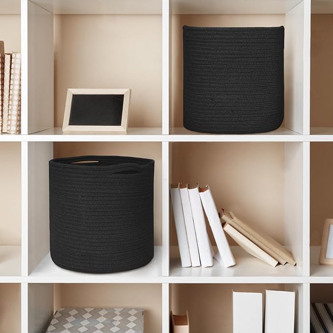 Cotton Rope Plant Basket, Woven Basket Planter for 10 inch Pot, Round Indoor Tree Pot Cover, Small Storage Bin Organizer, Modern Basket for Plants and Home Decor, 11”X11”, Black