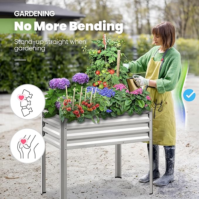 - 【Height: 30", Ergonomic Design】The galvanized raised garden bed stands at a comfortable height of 30 inches, eliminating the need to bend or kneel and sparing your back and knees from strain. It makes a perfect gift for relatives, friends, and anyone passionate about gardening.
