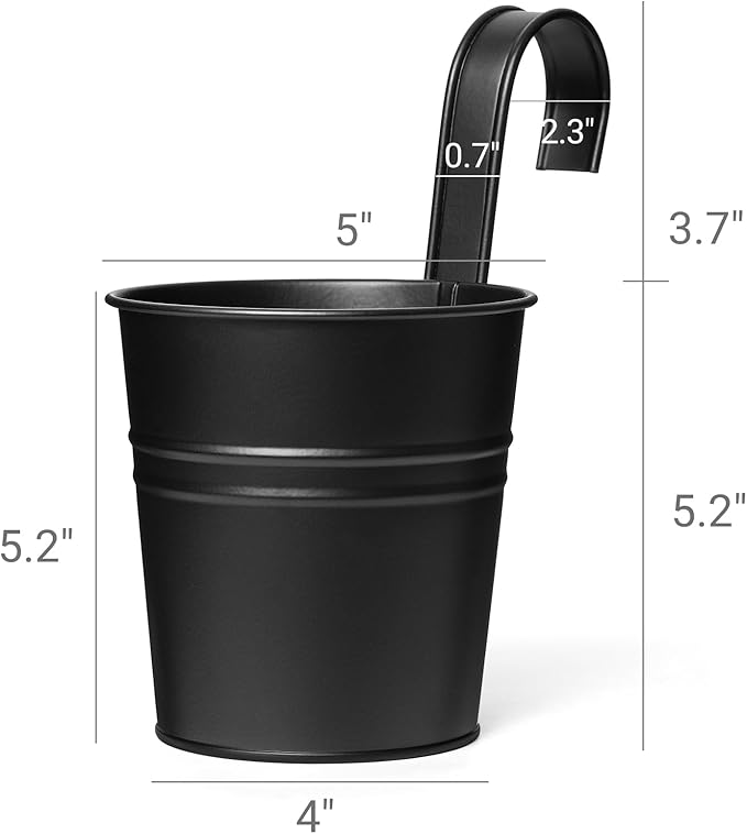 - Size:Diameter 5“, bottom diameter 4", height 5.2". The hook size is 3.7" x 1.5" x 0.7".Pay attention to:The hook is disassembled for transportation,you need to install the iron bucket yourself when it arrive