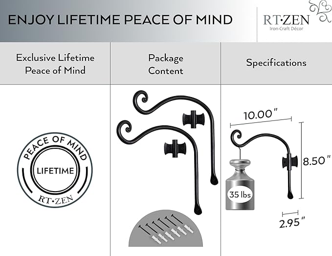 RTZEN Plant Hangers Outdoor or Indoor - Wrought Iron Metal Hanger Indoor Hook - Heavy Duty Wall Bracket Hooks for Hanging Plants Baskets Lanterns Wind Chimes - 2 Pack (Black Axe-Shape Hooks)