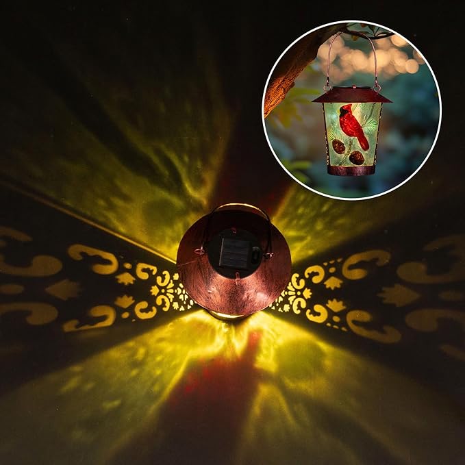 - Garden Art&Perfect Gift: Hang this whimsical solar lantern anywhere in your garden,patio,porch,wall,tree,deck,pergolas,sheep hooks or placed on flat grass or tables to enjoy projected patterns or add a fairytale touch. A perfect gift for Mother's Day, birthdays, housewarmings, and more, the red bird lantern brings endless joy to your loved ones on special occasions.