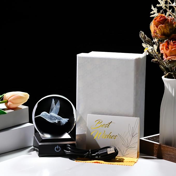 - 🍀Crystal Ball Hummingbird Lamp- Crystal Glass Hummingbird Night Light size: 3.14". Made of K9 Crystal, Interior images are carved by Advanced 3D Laser Engraving Technology.
