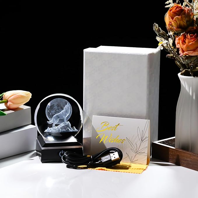 Qianwei Wolf Gifts: 3D Crystal Ball - 3.14'' Laser Decor Glass Animals Figurines Statue & Night Light