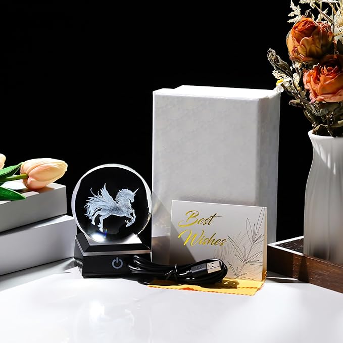 - 🍀Crystal Ball Unicorn Lamp- Crystal Glass Unicorn Night Light size: 3.14". Made of K9 Crystal, Interior images are carved by Advanced 3D Laser Engraving Technology.