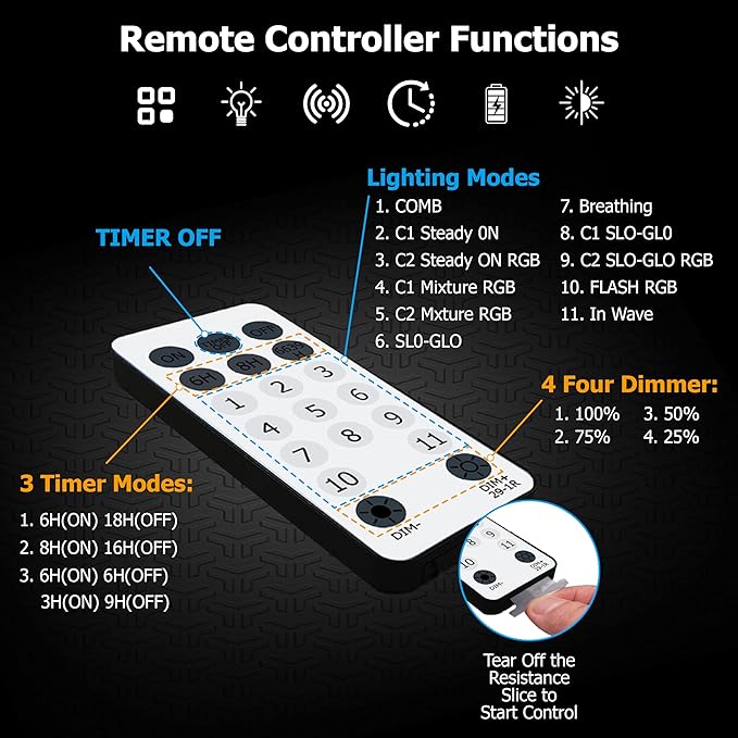 - 【2 Control Methods】You can use remote control or press the button on the plug to switch the light modes. Long press the button on the plug for 3 seconds to start the timer function. When using the remote control, please aim at the plug, remote distance up to 26FT/8M)