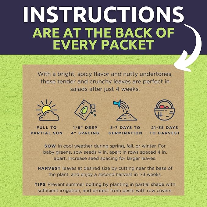 - 60 INDIVIDUAL SEED PACKETS: Roquette Arugula, Genovese Basil, Detroit Dark Red Beet, Cal Wonder Bell Pepper, De Ciccio Broccoli, Provider Bush Bean, Waltham Butternut Winter Squash, Nantes Carrot, Catnip, Tall Utah Celery, Santo Cilantro, Champion Collard Greens, Homemade Pickles Cucumber, Marketmore 76 Cucumber, Bouquet Dill, Rosa Bianca Eggplant, Florence Fennel, Parade Green Onion, Lacinato Kale, Buttercrunch Lettuce, Parris Island Romaine Lettuce.